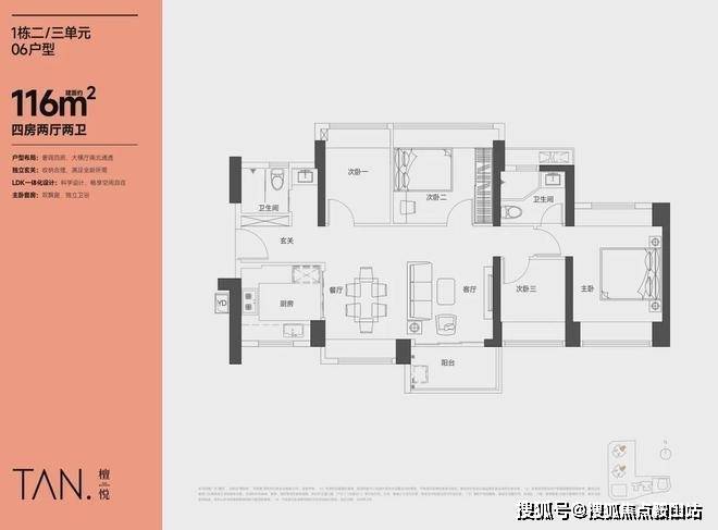 116㎡的4房2厅2卫,设计的是横厅南北通透格局,LKDB一体化设计,进门入户玄关,五开间朝南,超大宽面,主卧南北通设计,U型厨房,阳台主朝东南向。