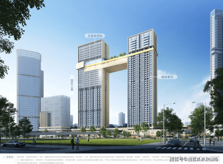 5-1地块承袭深铁府系豪宅基因,以“核心地段+地标形象”为打造方向,采用双塔布局,由1栋约170米高的酒店及商务公寓塔楼+1栋约155米高的住宅塔楼(61栋住宅单元)共同构成;两栋超百米高楼之间,由两层空中连廊连接,形成双子塔磅礴之姿。