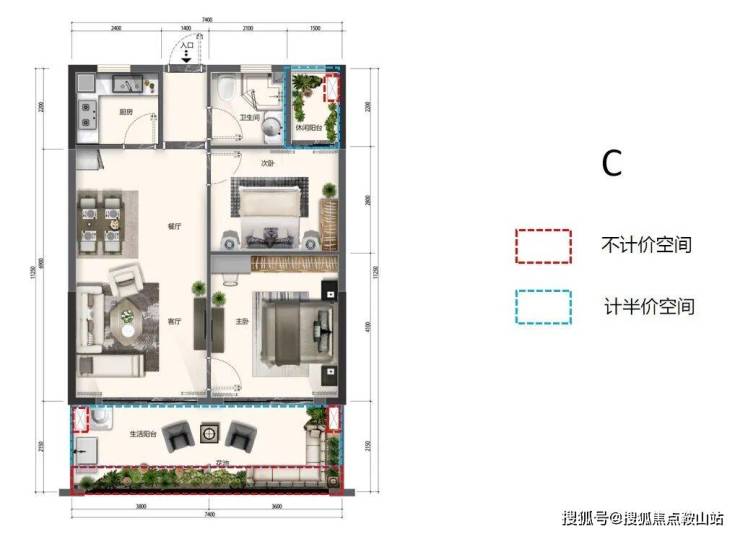 C户型 2房2厅1卫1厨 建面约91-97㎡