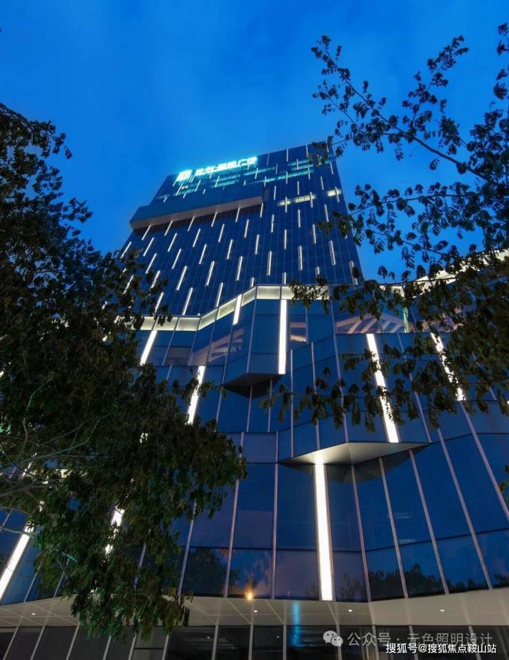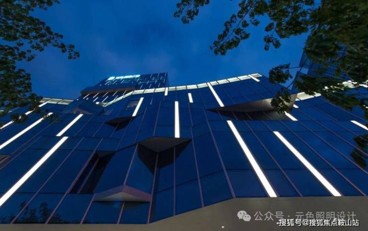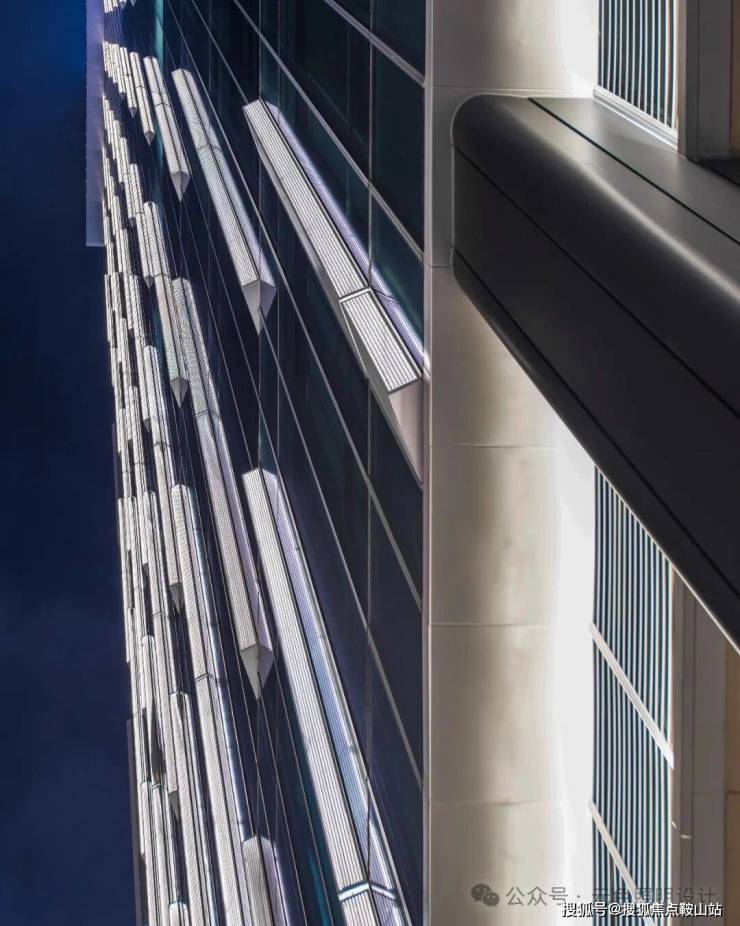 在裙楼顶的玻璃与铝板之前隐藏了洗墙灯,照亮铝板,形成裙楼顶部轮廓,清晰地反映出建筑裙楼的转折关系。