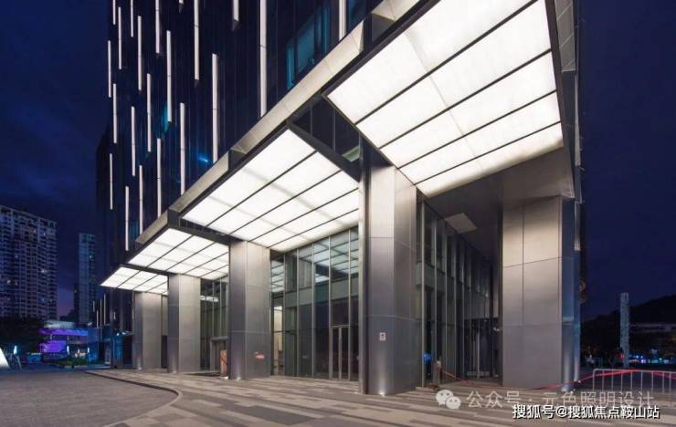 写字楼入口雨棚,采用内透的方式让乳白玻璃均匀发光,使得整个雨棚形成一个发光体,保证功能性照度的同时,又让雨棚整洁而大气,富有极强的现代感。