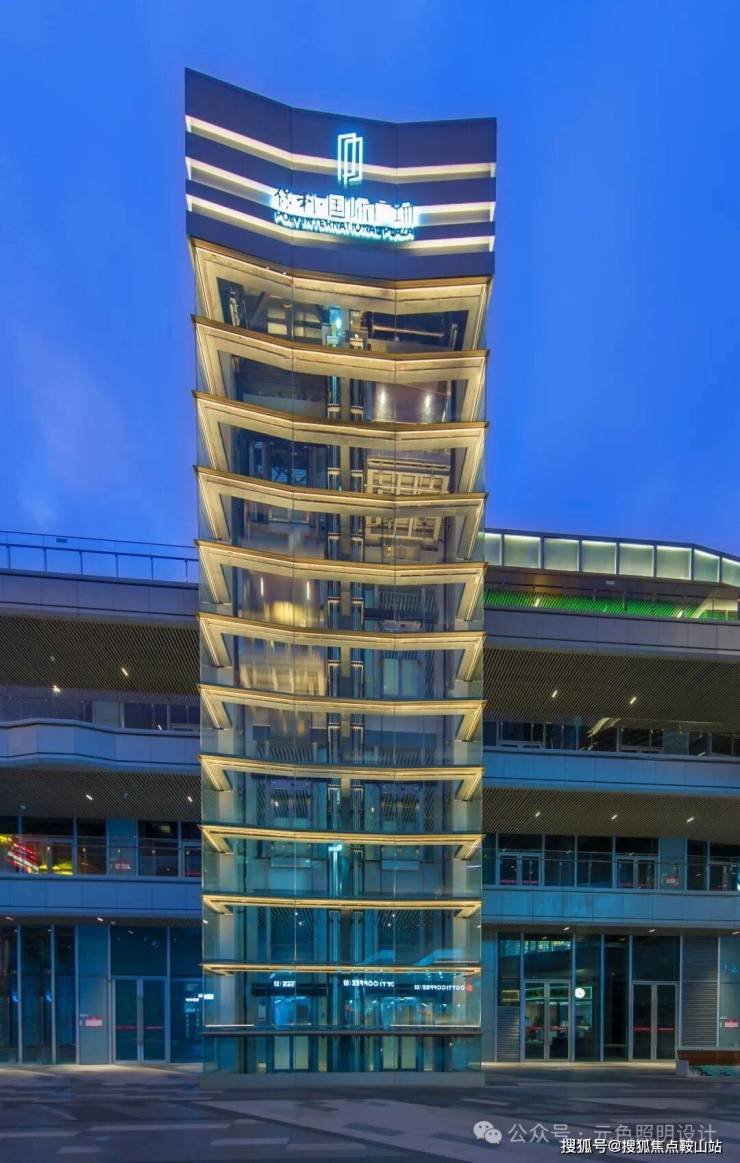 广场内部的观光电梯,用防眩光RGBW线性灯照亮每层横向铝板,统一的色彩变化为商业裙楼增加了浓厚的商业气息。光与玻璃的内透与形成完整的透光玻璃盒子,成为中庭视觉中心。