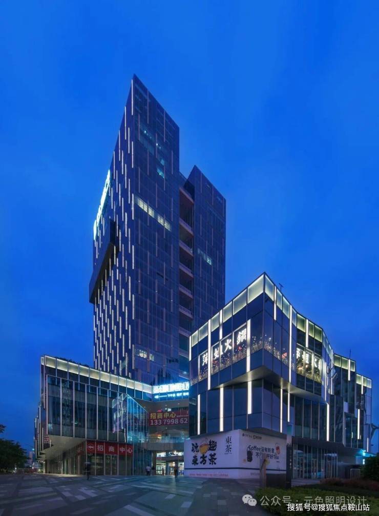 裙楼立面延续着塔楼的元素,幕墙综合灯光分布长短不一的发光面板,通过对面板的内透,形成均匀的灯箱效果,既丰富了裙楼立面,延续了建筑立面特征,也为裙楼增加新的元素及商业氛围。