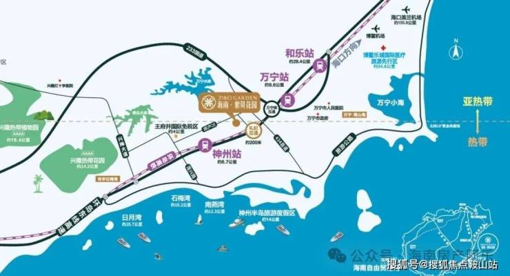 沿高速公路7公里范围内可达神州高铁站、兴隆温泉度假区及王府井国际免税城,沿高速公路13公里轻松抵达石梅湾海岸。
