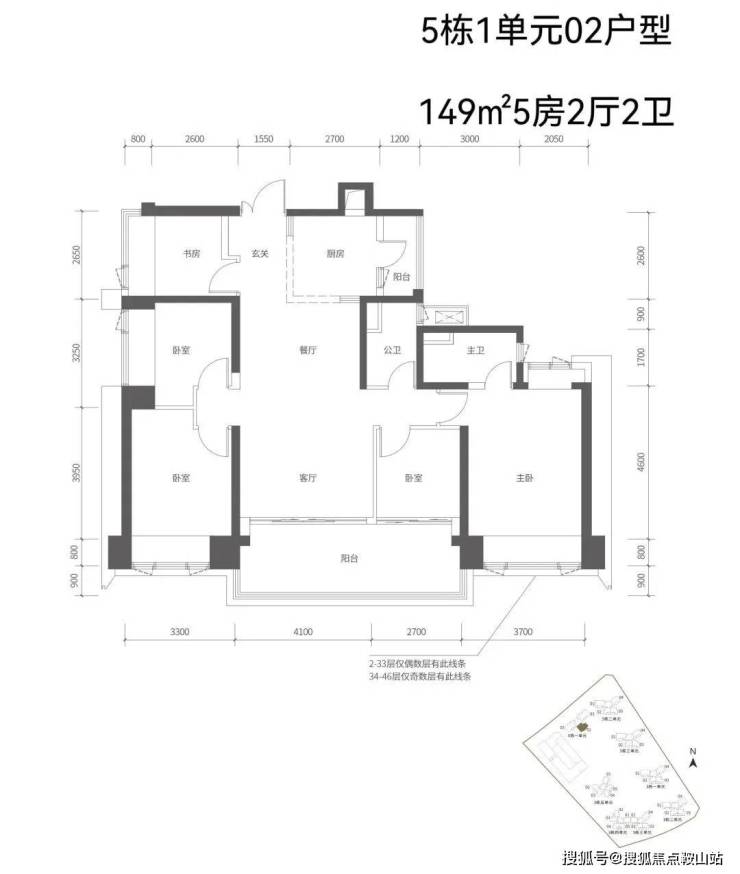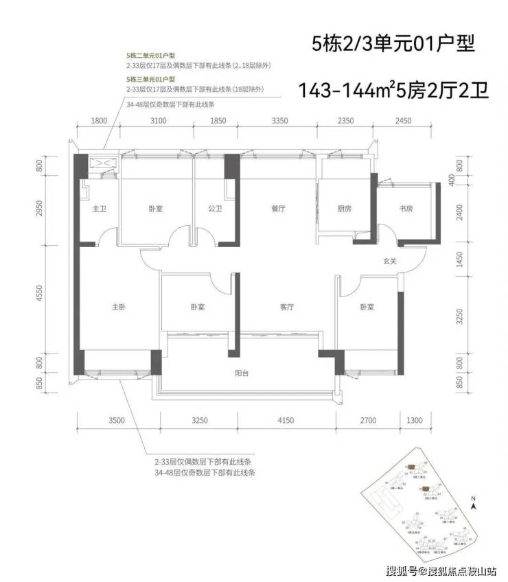 【五栋一单元-平面图】3梯3户,3条腿,分别是01、03号房户型约173㎡的5房2厅2卫、02号房户型约149㎡的5房2厅2卫