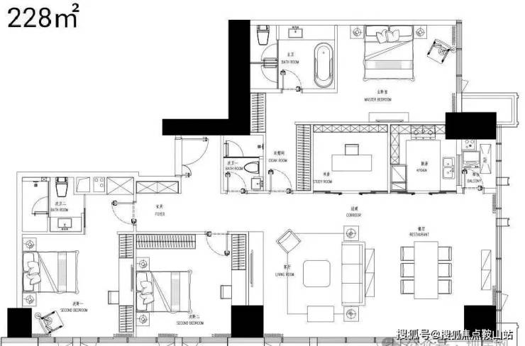 228平4房,整体空间感较强,最大的特色是主次卧全是套间,多窗设计也为通风采光作保障。