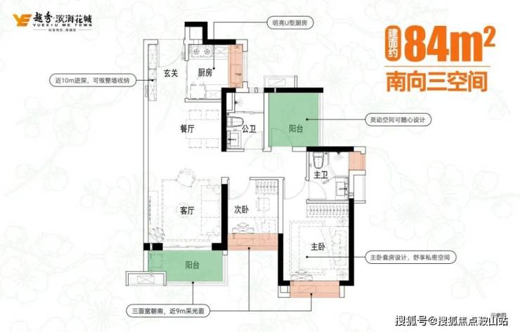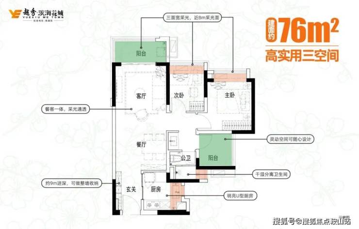 建面89平的户型,项目做了三个270°视野(景观阳台、主卧和次卧),并且还是三空间带主套。