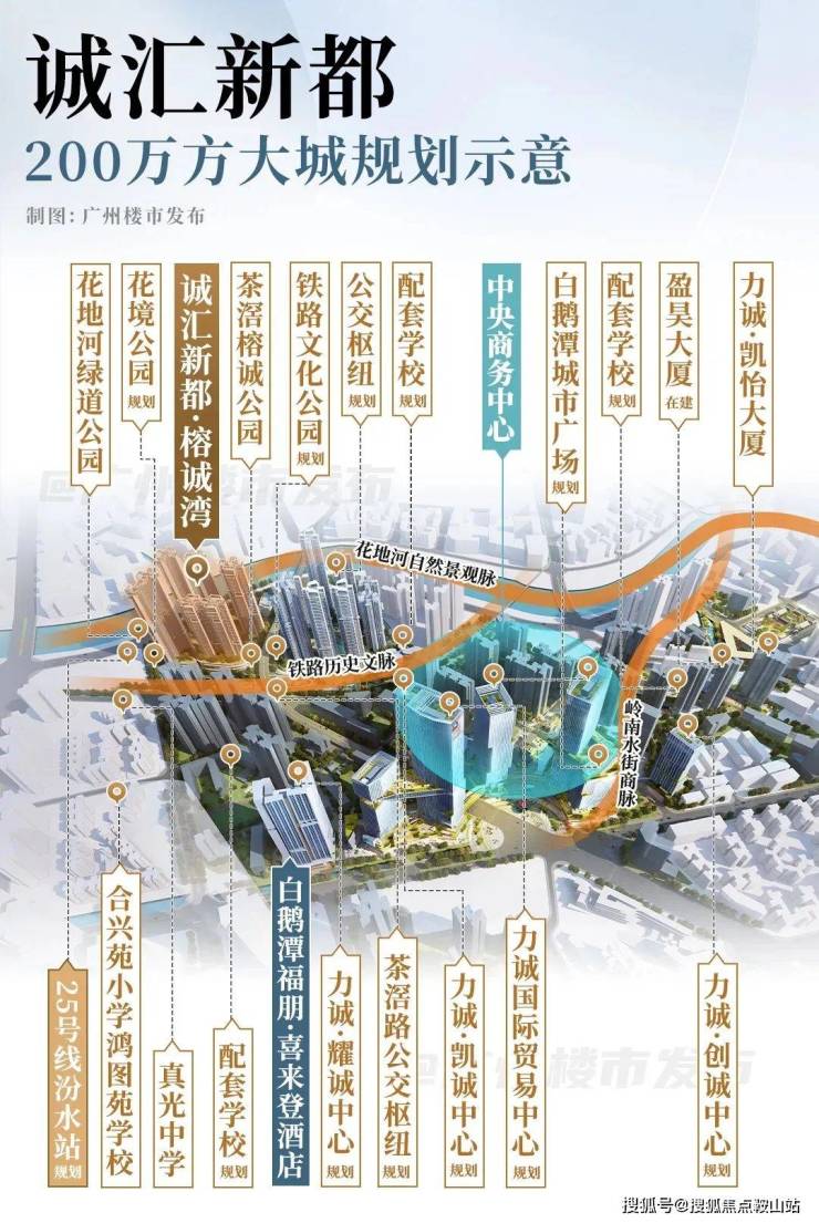 🏙力邀城市地标设计之父——冼剑雄先生打造建面逾百万方江幕宜居都会样本,布局“一心三脉”规划:中央商务之芯组团、千年珠江水脉、茶滘水岸风情街商脉、铁路历史文脉。