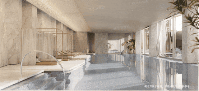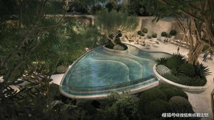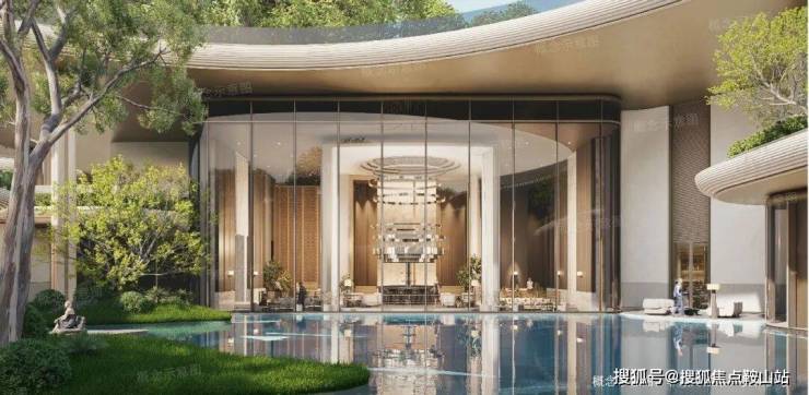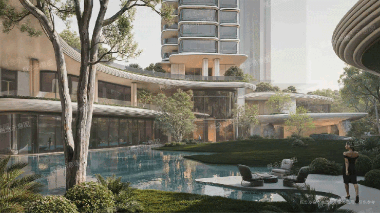 一层是亲水社交的“海心”。约700-800㎡的“海洋之心”水景,像是一片浓郁海蓝宝,点亮会所和园林,也成为郁郁葱葱绿色层层向外荡开的中心。