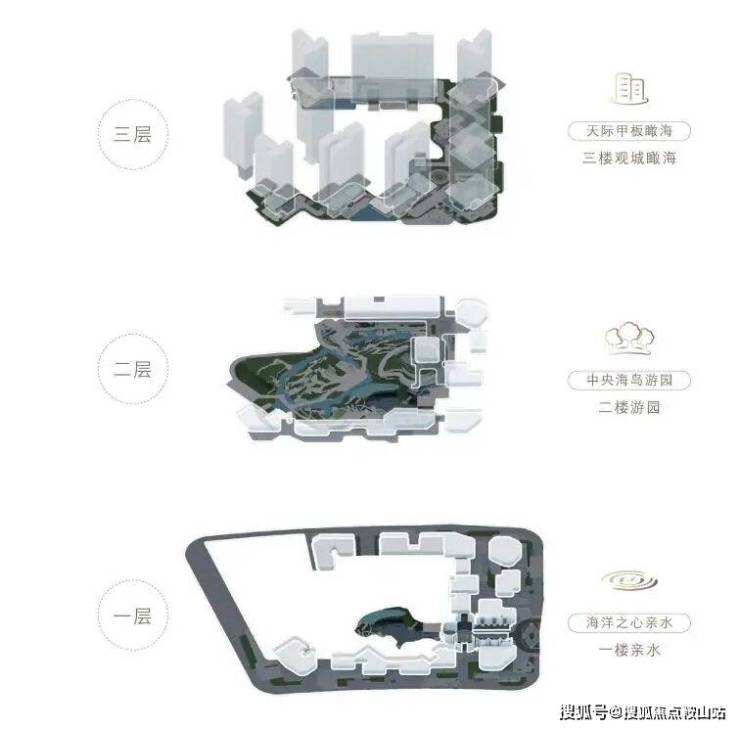 再往里走,整座底盘最核心的部分——约5.3万㎡的三层立体滨海园林。设计灵感来自澎湃大海中的“海心岛”,以“森海·浮屿”为概念,整个项目被理解为“海心”底盘上漂浮的10栋“岛屿”楼宇。