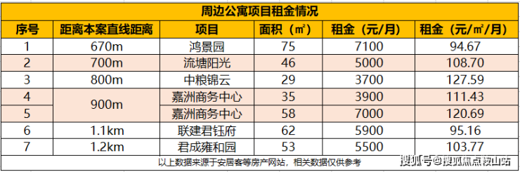 目前距离本项目约700m的45㎡产品的月租金可达5000元,同时周边73㎡产品的月租金可达7000元。