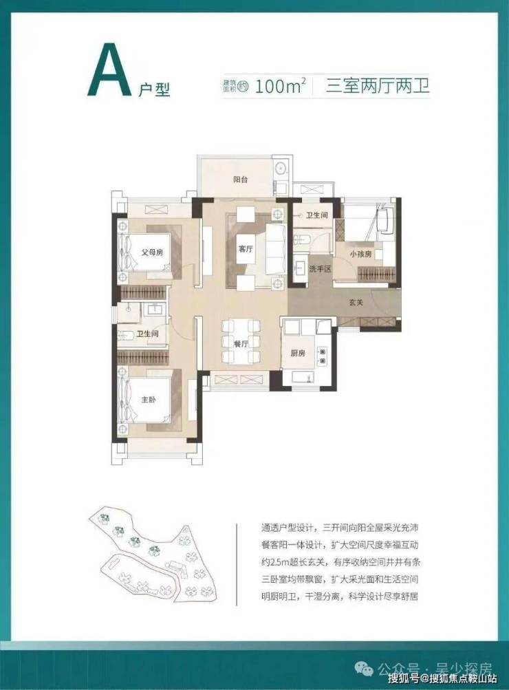 100㎡的3房2厅2卫,设计的是竖厅双龙抱珠格局,进门入户玄关,客厅3.5米开间,LDKB一体化设计,三开间朝南,3个卧室分别做到了主卧11.88㎡/次卧10.73㎡/次卧8.25㎡,U型厨房,公卫三段式分离设计,得房率:79.25%(不含赠送),阳台朝西北或东北向,看山景。