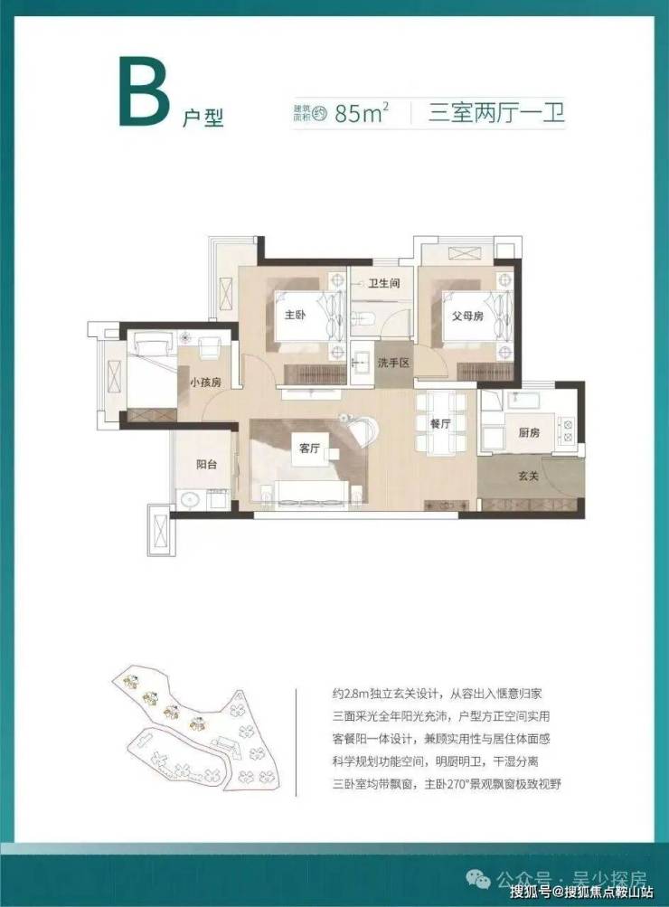 85㎡的3房2厅1卫,设计的是竖厅格局,进门入户玄关,客厅3.5米开间,LDKB一体化设计,3个卧室分别做到了主卧9.9㎡/次卧8.91㎡/次卧8.1㎡,U型厨房,卫生间三段式分离设计,得房率:79.26%(不含赠送),阳台朝西南或东南向。