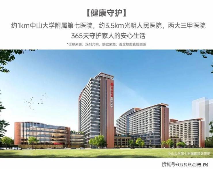 医疗:项目1公里内有中山大学附属第七医院,3.5公里处有光明人民医院,均为三甲医院。中大七院设备先进,医生团队知名,提供全面医疗服务,保障业主及家人健康。