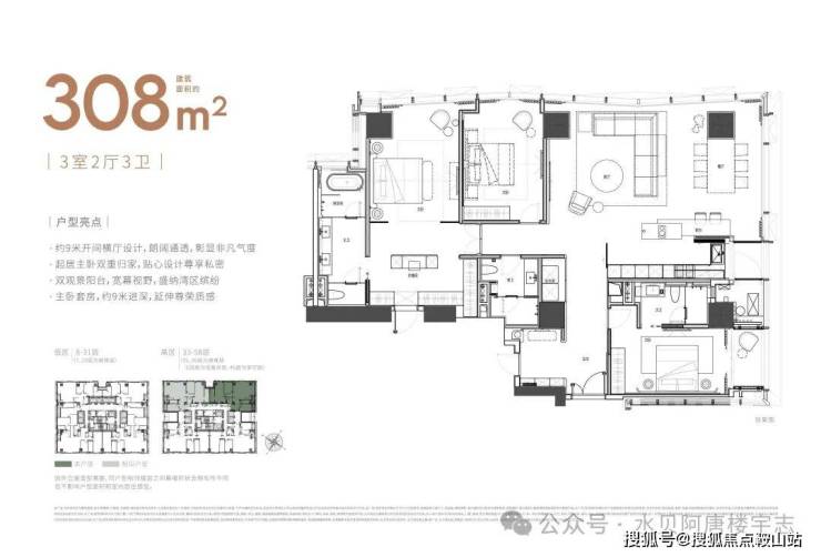 大平面大尺度定位,层高约3.6米,横厅设计确保奢阔观景面,全户型纵享环幕视野。项目打造建面约215-620㎡纯粹品质公寓,顶层为建面约1270㎡公寓产品。
