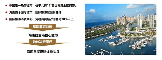 三亚是南中国对外门户,凭借优质城市基础奠定自贸核心城市地位,形成自贸城市发展标杆;投资三亚就是中国这个大公司的合伙人,享受自贸发展带来的时代机遇以及红利。