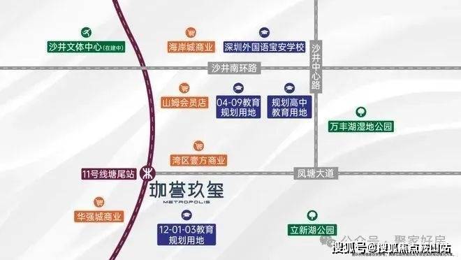 项目位于沙井新桥,珈誉府本身是一个大型综合体,自身配套丰富,自带50万㎡大型商业;地铁11号线塘尾站挨着项目,深圳外国语宝安学校在项目南北两侧,且靠近万丰湖、立新湖,有生态资源。