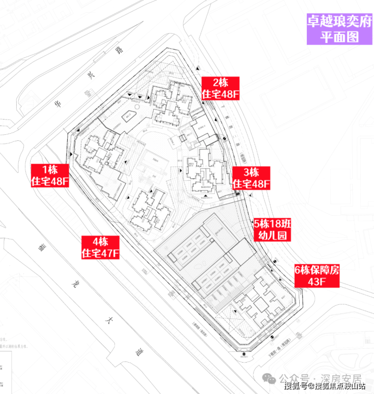 卓越琅奕府一期,总占地面积约2.58万㎡,总建筑面积约22.97万㎡,计容建筑面积约16.08万㎡,容积率5.84,绿化率40.12%,共由5栋总高43-28层的住宅组成,其中1/2/3栋住宅48F,4栋住宅47F,6栋保障房43F,5栋是1所18班制幼儿园,保障房跟商品房分开管理,商品房独立小区。