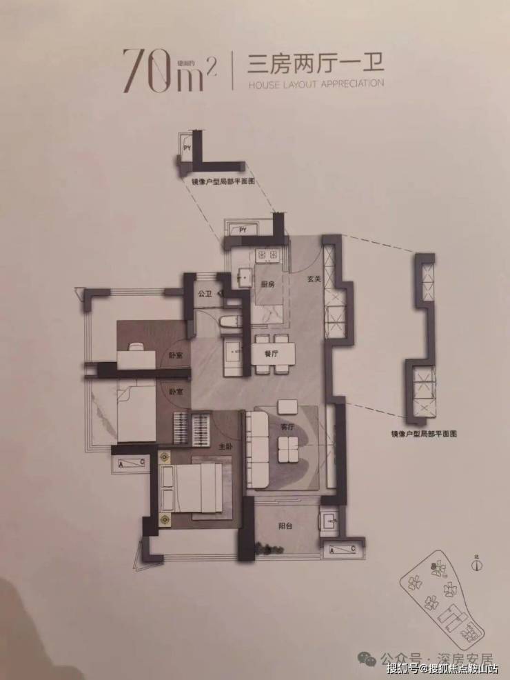 约70㎡ 3房1卫:刚需极致上车,同片区少见小面积三房;LDKB一体化、U型厨房;得房率预计接近100%(含赠送/飘窗);适合单身/小家庭;附户型示意图