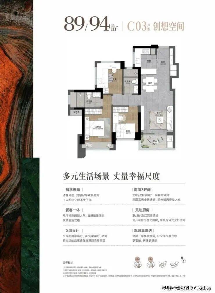 89-94㎡的4房2厅2卫,03.04户型,设计的是经典竖厅格局,进门入户玄关,客厅实测3.245米开间,LDKB一体化,S墙设计预留冰箱卡槽位,三开间朝南,3个卧室分别做到了主卧13.76㎡/次卧8.28㎡/次卧7.74㎡(实测面积,不含墙体),U型灵动式厨房,卫生间干湿分离,得房率约76-81%(不含赠送),东南朝向。