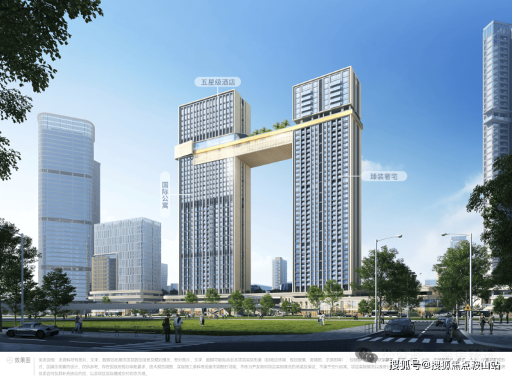 5-1地块采用双塔布局,一栋约170米高的酒店及商务公寓塔楼,另一栋为约155米高的住宅塔楼(61栋住宅单元),两栋建筑通过两层空中连廊相互连接。
