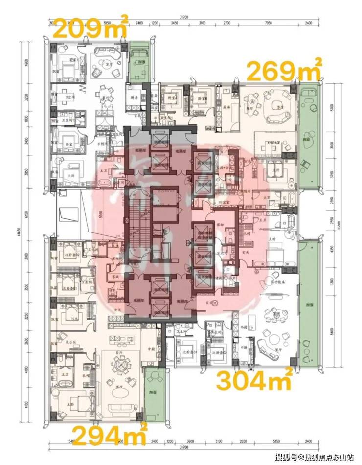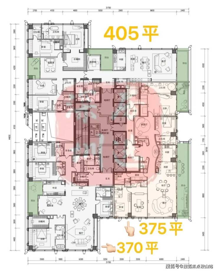 ②高区42F起(150-200米)是约370-375-403㎡4+1房五卫+家庭厅+家政套间;