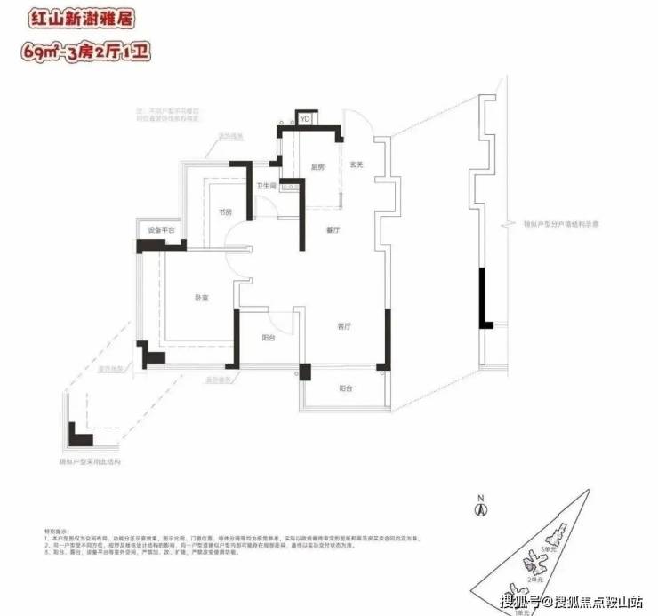 69㎡的3房2厅1卫,设计的是竖厅格局,客厅3米开间,LDKG+X空间一体化,S墙设计预留冰箱卡槽位,动静分区,三开间朝南,主卧+1个次卧都是双飘窗设计,次卧带1个设备平台放空调机位,U型厨房,卫生间三段式干湿分离,得房率:100.1%(包含赠送),西南朝向。