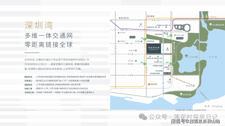 【交通-零时差生活圈】:深圳湾CBD正轴,临近深圳湾口岸,四横四纵的发达路网,三地铁交汇,世界级无界国际交通网络,尽享最高效世界级生活品质及商务效率。