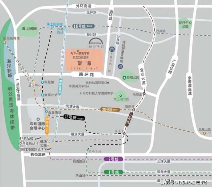目前项目周边有11号线和在建的地铁12号线、20号线和穗莞深城轨,但项目刚好处在几个站点的几何中心,距离大致在1.7-2公里,步行距离稍远临近宝安大道、107国道、东部沿海高速、沙井路、南环路等多条主干道。