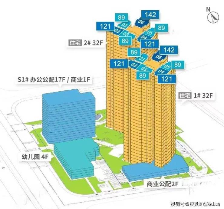 项目规划了1栋商业楼(17F)、1所幼儿园(3F)在路边,2栋住宅(32F)