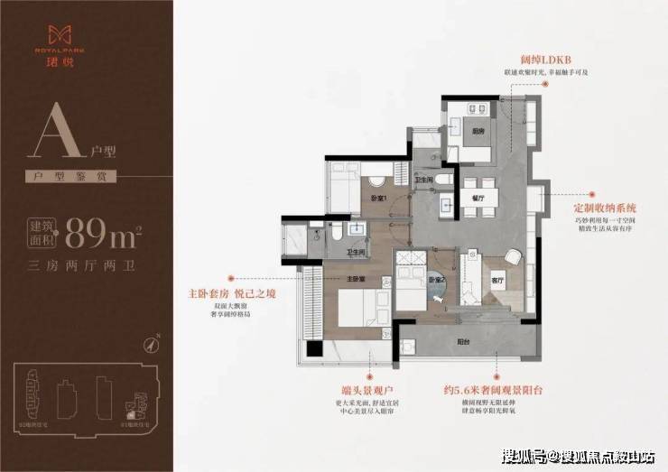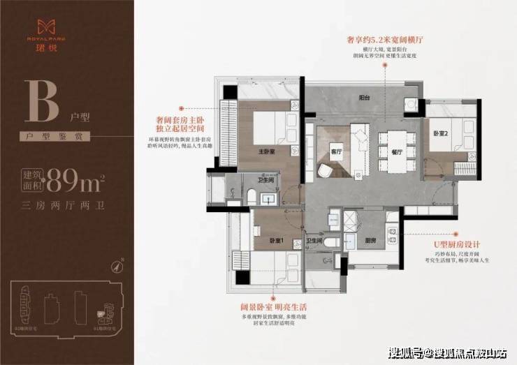 89㎡三房二卫A/B户型,位于1栋一单元,两开间阳台,主卧都有双面凸窗赠送。