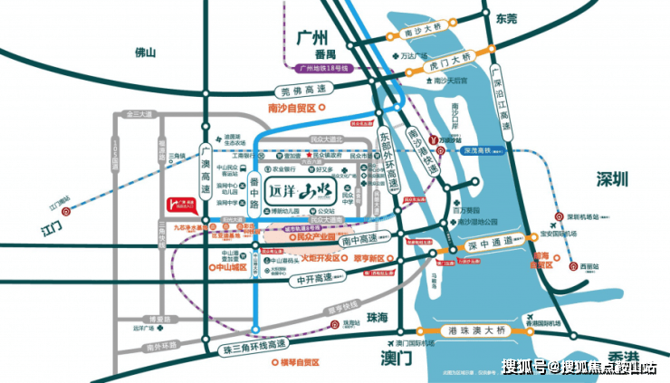 近邻南沙 畅享广中深三城生活圈远洋山水紧临省道S111(番中路),接壤广州南沙,毗邻翠亨新区。约5公里接驳广澳高速,约8公里迅达南沙自贸区;坐享广澳高速、南中高速(建设中)、深中通道(建设中)、东部外环高速(建设中)等立体路网。