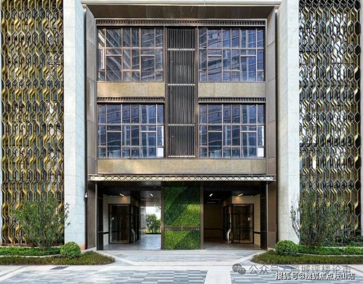 东侧主入口标志性的钢结构雨棚。地块东南两侧分别是香远路、益清路,源自宋代周敦颐的《爱莲说》“香远益清,亭亭净植”。而主入口的艺术钢结构雨棚,取自莲叶何田田的设计要素,由十四个类似菏叶的椭圆拼接而成,高达13米,极具昭示性,体现出住户出众的身份和品味。再结合入口层叠式的水景,符合堂前聚水的风水理论,可谓交相辉映。