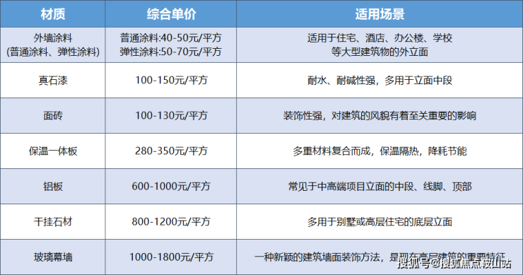 市面上,常见的外立面材料的综合单价从几十元到上千元不等,成本差距越大,品质呈现差异就越突出。