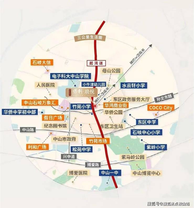 项目位于中山东区行政板块,周边居住氛围成熟,商业、教育、医疗配套优质;西侧紧临主干道起湾道,交通优势显著。