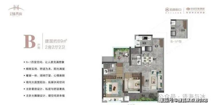 79㎡2+1房:3开间朝南,主卧带飘窗,N+1空间可改造为书房或儿童房,适合年轻家庭。