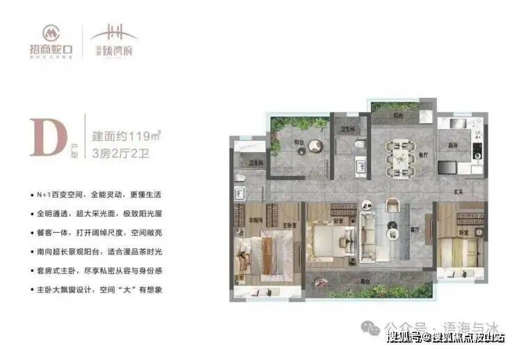 105㎡3+1房:南北双阳台设计,南向6米景观阳台,主卧套房带独立衣帽间,改善升级首选。