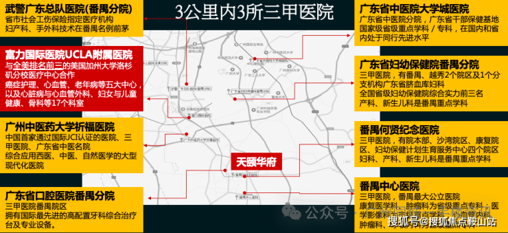 ④ 3 公里可达何贤纨念医院、番禺中医院、番禺中心医院、广东省口腔医院等。
