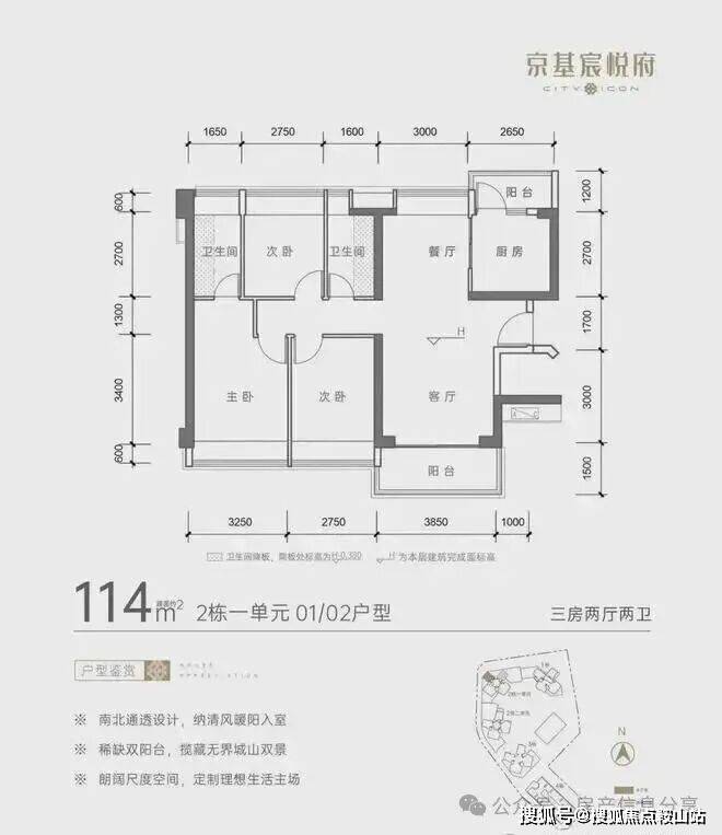 其中,建面约110-114㎡3房2厅2卫: