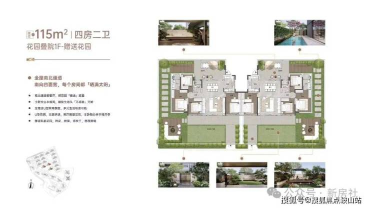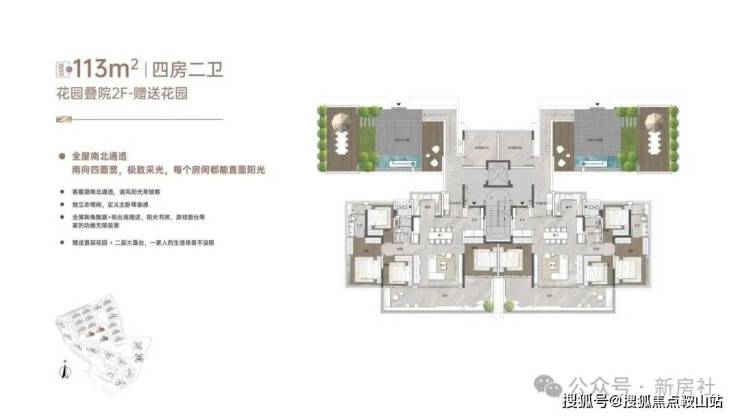 “玥境”为滨江小叠院,主打112-130㎡低密叠院,最大亮点是超高赠送率,1F、2F户型赠送私属花园,3F赠送超大景观露台,4F复式设计,赠送顶层天台。