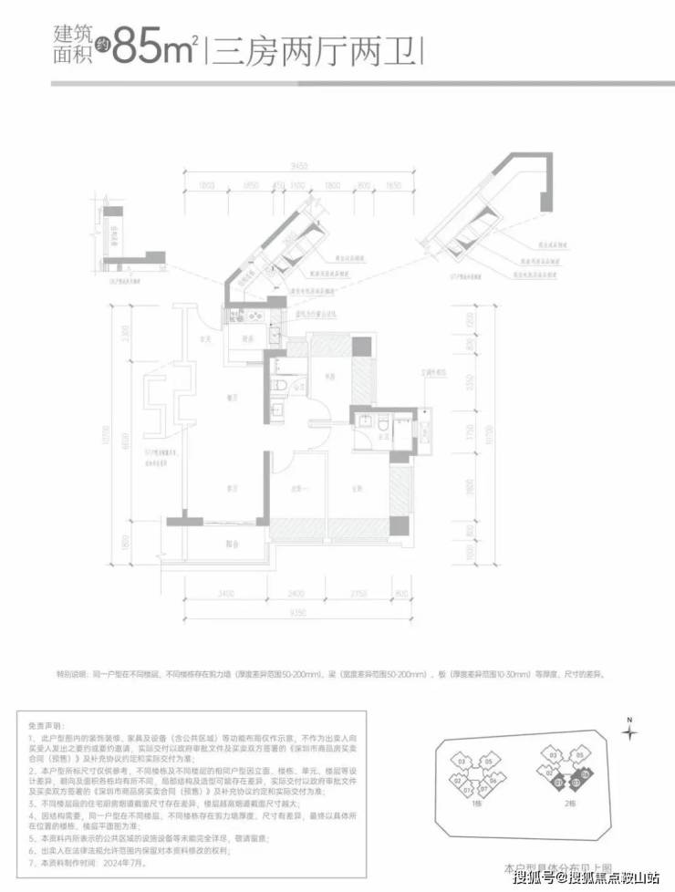 85㎡的3房2厅2卫,设计的经典竖厅格局,客厅3.4米开间,得房率约:95%(包含赠送),阳台进深1.8米,有西南或东南朝向。