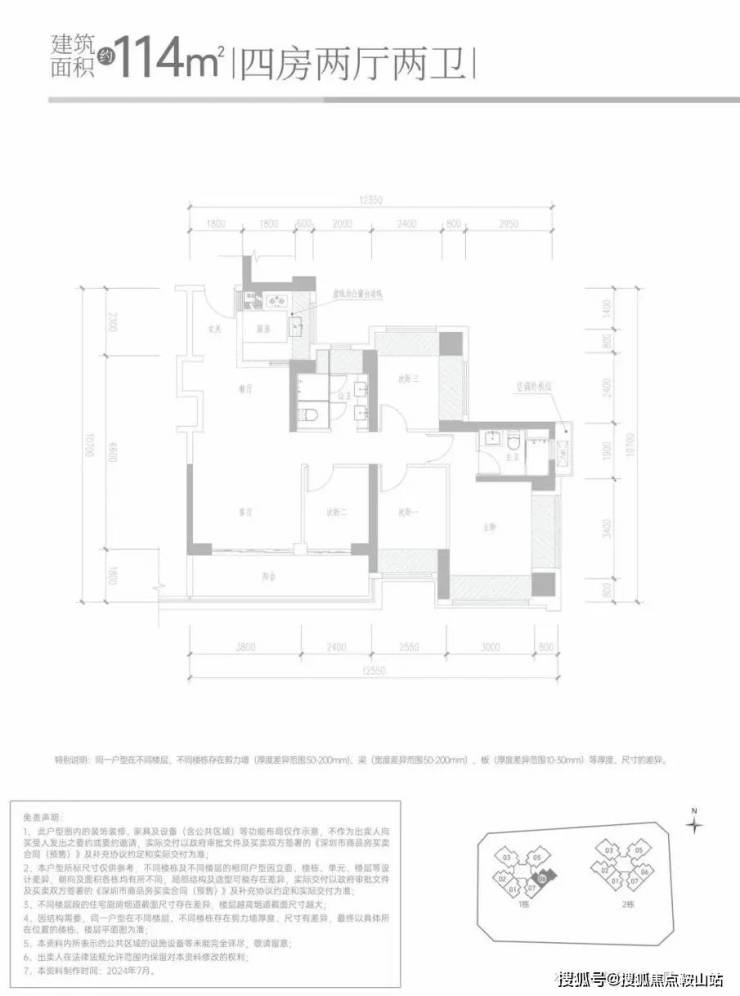 114㎡的4房2厅2卫,设计的是经典竖厅格局,客厅3.8米开间,得房率约:95%(包含赠送),客厅连接次卧出6.2米的大阳台,朝东南向。