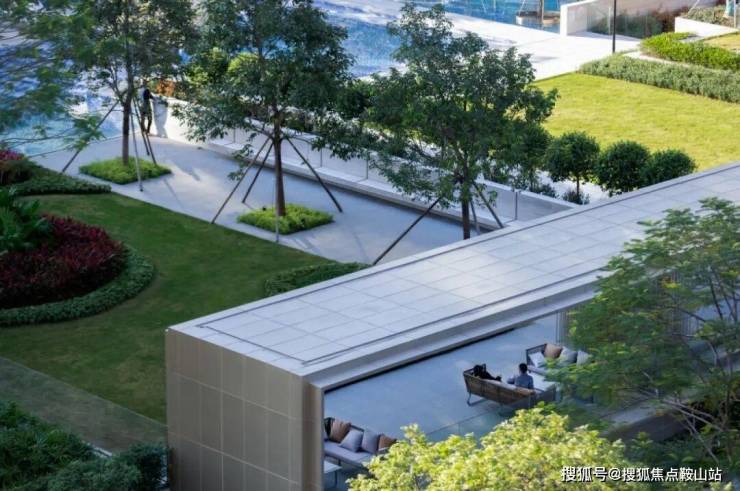 設計利用地形起伏,圍繞景觀水景建起涵蓋林下休閑、戶外會客、陽光草坪等多元化功能的城市客廳,結合節點處的蔥蘢綠植和隨時間更叠的光影變化,構築趨向於自然演繹的院落式生態場景。