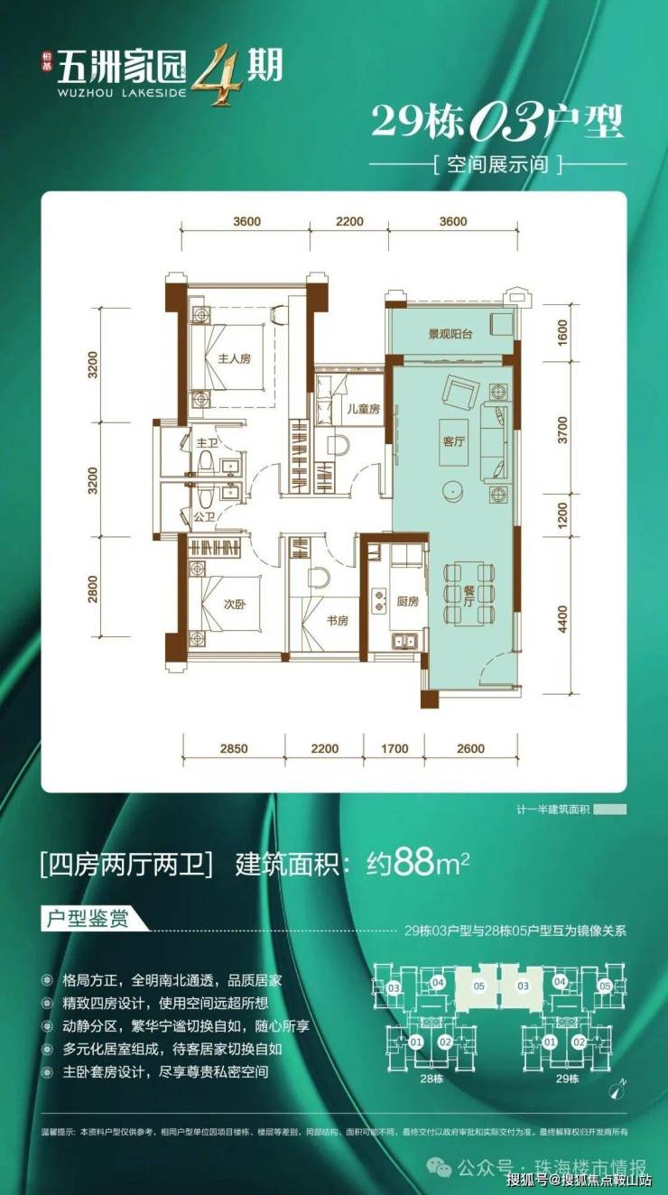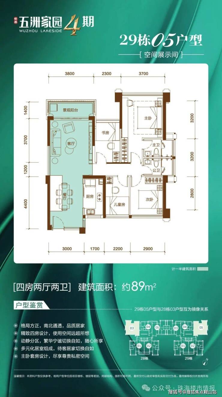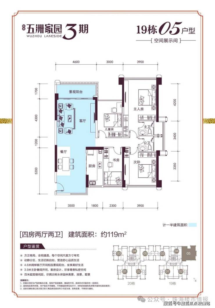 五洲家园整体南低北高半围合,呈现背后有靠山的太师椅形状,采用向南开敞的半围合式布局,户户均有朝南面,一半以上户型做到南北通透,视野宏阔通透,摒弃户与户之间的对视尴尬。