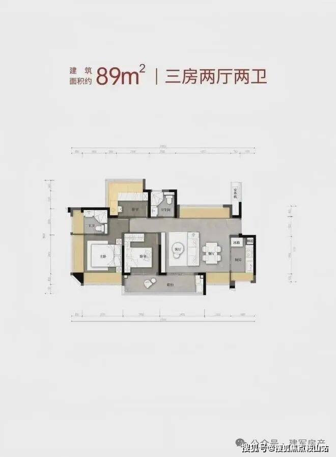 89㎡的3房2厅2卫,1栋04户型,设计的是横厅南北通透格局,客餐厅5.4米开间,LDKB一体化设计,分别做到了主卧16.02㎡/次卧9.07m²/次卧8.26㎡(包含墙体飘窗),客厅连接次卧出9.3m²的巨幕大阳台,L型厨房,卫生间干湿分离,得房率约79.6%(不含赠送),阳台主朝西南向。套内面积70.43m²+赠送面积21.17m²=实用面积91.6m²,加上赠送面积后得房率103.55%。