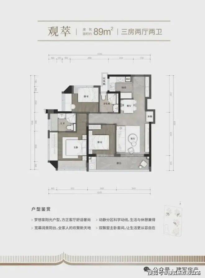 89㎡的3房2厅2卫,1栋02.03户型,设计的是经典竖厅格局,客厅3.4米开间,LDKB一体化,S墙设计预留冰箱卡槽位,动静分区,分别做到了主卧16.28㎡/次卧9.53㎡/次卧9.42㎡(包含墙体飘窗),U型厨房,卫生间干湿分离,得房率约79.6%(不含赠送),客厅连接次卧出9.45m²观景大阳台,西南朝向。套内面积70.43m²+赠送面积14.58m²=实用面积85.01m²,加上赠送面积后得房率96.1%。