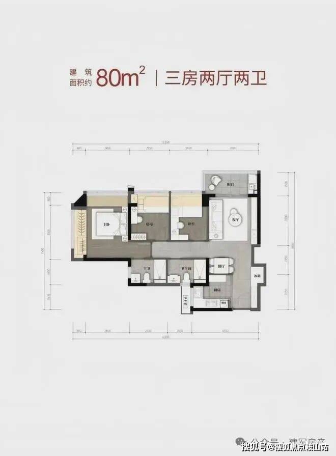 80㎡的3房2厅2卫,设计的是竖厅格局,客厅3.3米开间,LDKB一体化,S墙设计预留冰箱卡槽位,动静分区,分别做到了主卧16.38㎡/次卧8.16㎡/次卧7.84㎡(包含墙体飘窗),U型厨房,卫生间干湿分离,得房率约79.6%(不含赠送),阳台4.95m²东北朝向。套内面积63.98m²+赠送面积11.55m²=实用面积75.53m²,加上赠送面积后得房率94%。