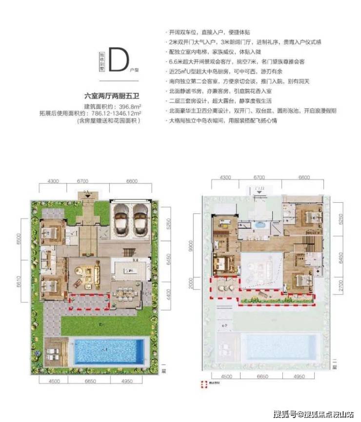 六室两厅两厨五卫,建筑面积约396.8㎡,拓展后使用面积约786.12—1346.12㎡(含房屋赠送和花园面积)