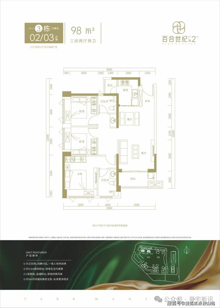 百合世纪广场二期(B-02地块),总占地面积约3.6万㎡,总建筑面积约27.03万㎡,计容建筑面积约19.38万㎡,共由3栋7个单元组成,总高是31-48层的住宅,其中1栋1单元住宅42F,1栋2单元住宅47F,2栋1单元住宅46F,2栋4/5单元住宅48F,3栋1/2单元住宅31F,另外2栋2单元公寓30F,2栋3单元商务办公楼22F,4栋是1所九班制幼儿园。