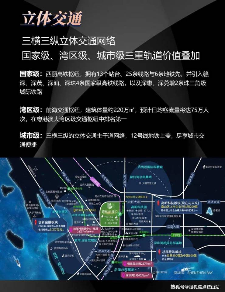 地铁上盖物业,无缝接驳地铁12号线中山公园站,经深南大道、月亮湾大道、北环大道新城立交,直通前海。前海交通枢纽,海、陆、空、轨四维立体交通,畅达粤港澳大湾区各大城市。